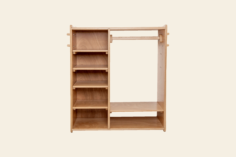 As your child grows, our Montessori Children's Wardrobe offers flexibility and customization to fit their changing needs. The shelves can be easily adjusted to different heights, giving you plenty of space for different clothes and accessories. You can position the hanger bar at a height that works best for your child, making it easy for them to reach their clothes. Plus, you can assemble the hanger side on either the left or right to suit your room and wardrobe setup.